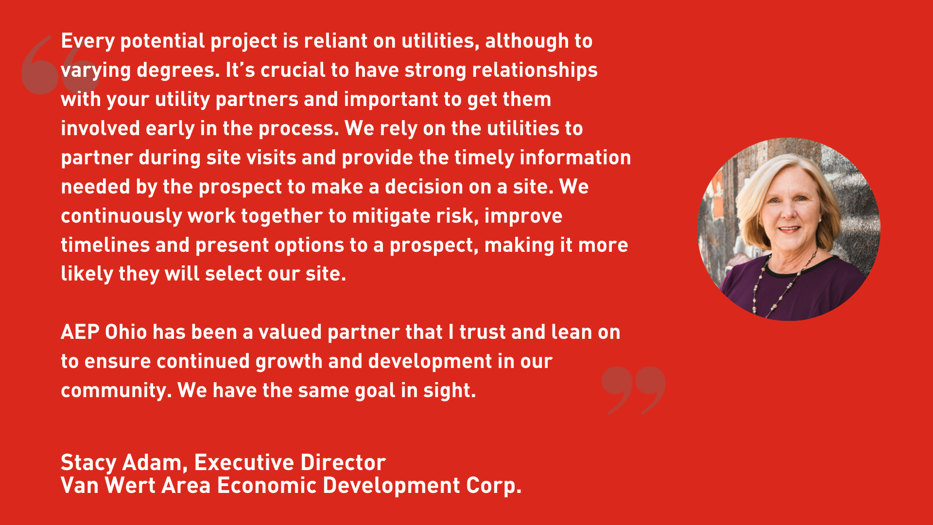 “Momentum is building here in Ohio and I’m passionate about keeping it going,” Amy says. “It’s not just about ribbon-cutting. As we’ve seen from recent large announcements, Ohio is globally competitive and there’s a whole pipeline of potential projects that could bring new businesses and grow existing businesses in our territory. So we’re not done.”